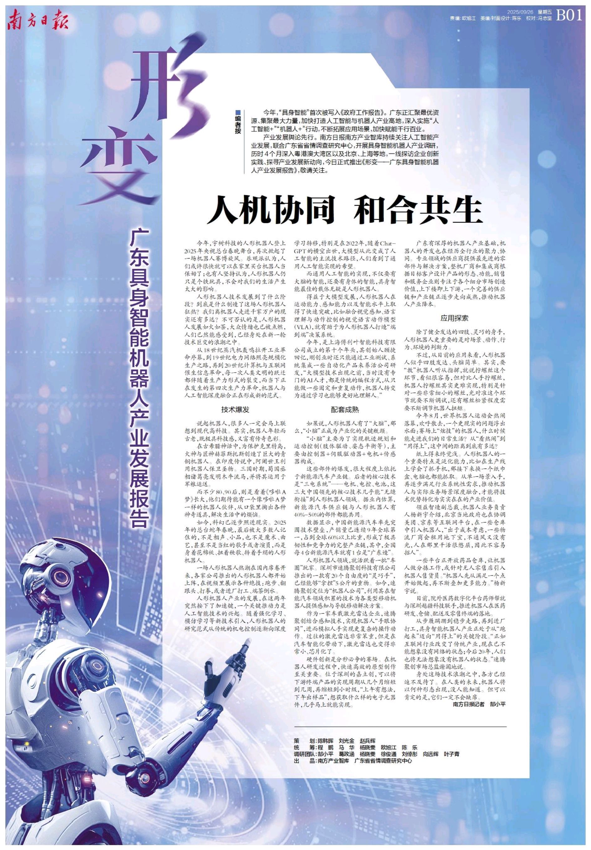 产业发展舆论先行。南方日报南方产业智库持续关注人工智能产业发展,联合广东省省情调查研究中心,开展具身智能机器人产业调研,历时4个月深入粤港澳大湾区以及北京、上海等地,一线探访企业创新实践、探寻产业发展新动向,正式推出广东具身智能机器人产业发展报告。
